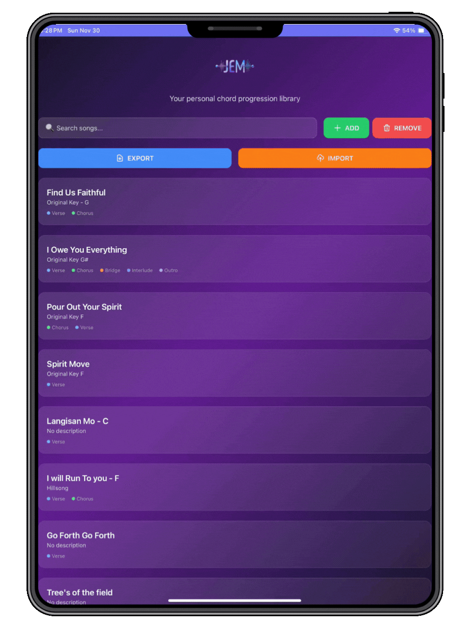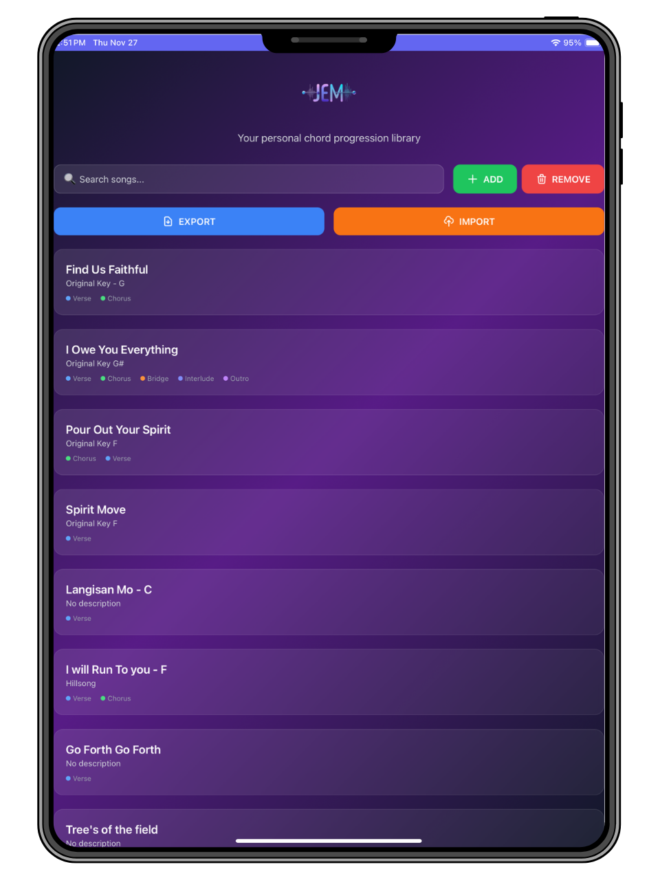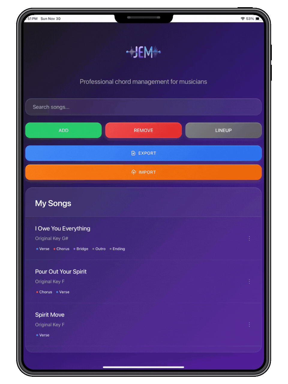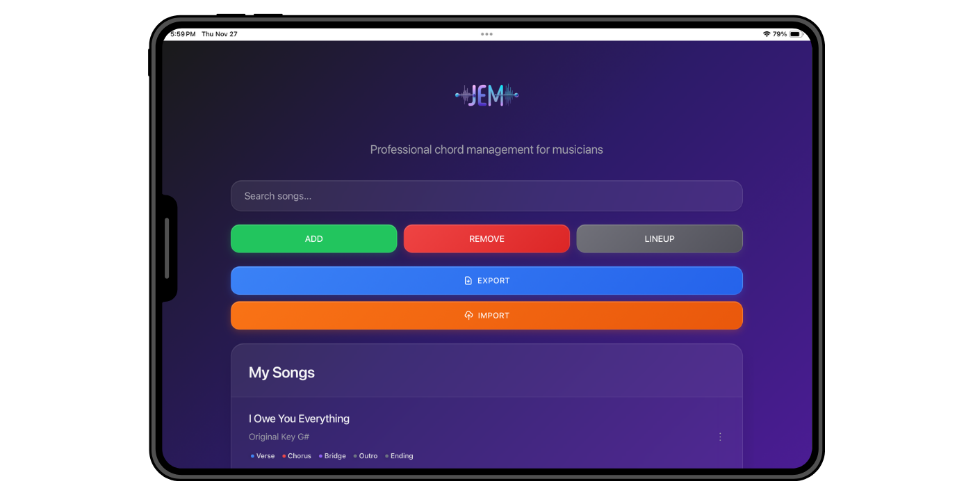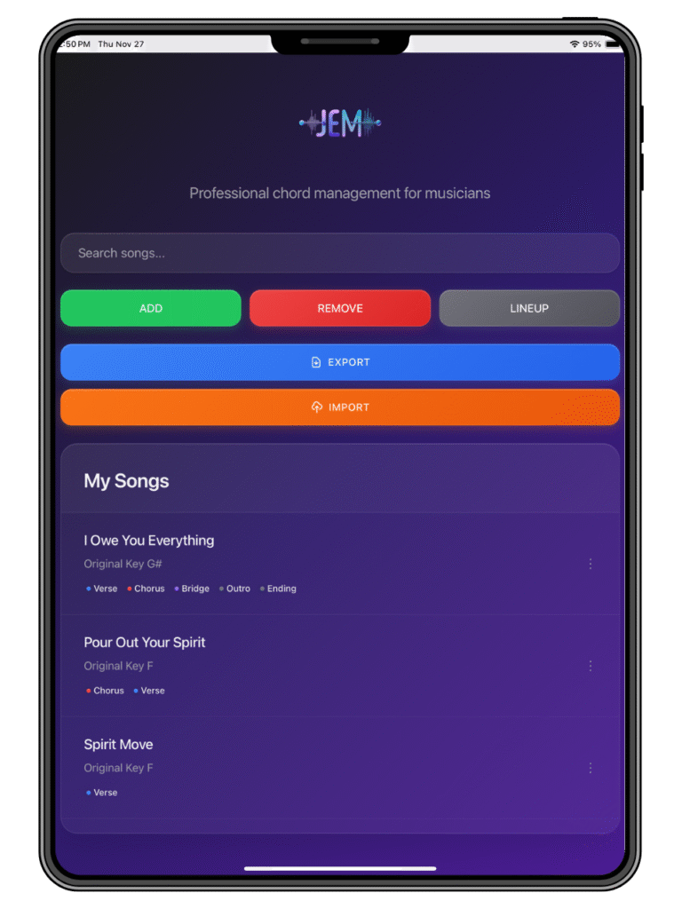 The Pro JEM Personal Chord Library is a powerful and intuitive app designed for musicians, worship leaders, and performers who need a fast, organized way to manage song chords and performance lineups.