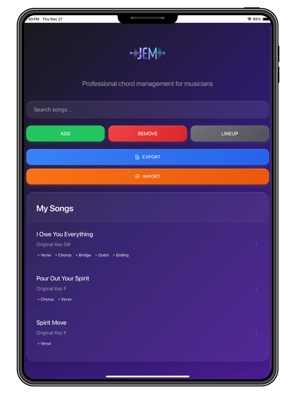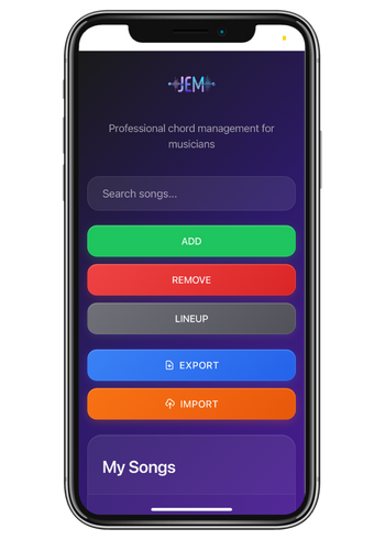 With a clean interface and smart features like key transposition, drag-and-drop lineup organization, and custom chord input, Pro JEM gives you complete control over your music library — right from your phone or tablet.